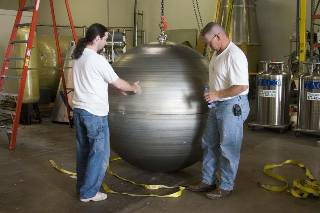 together, with holes for tack welding every two feet or so. We were able to bang the 36 spheres pretty