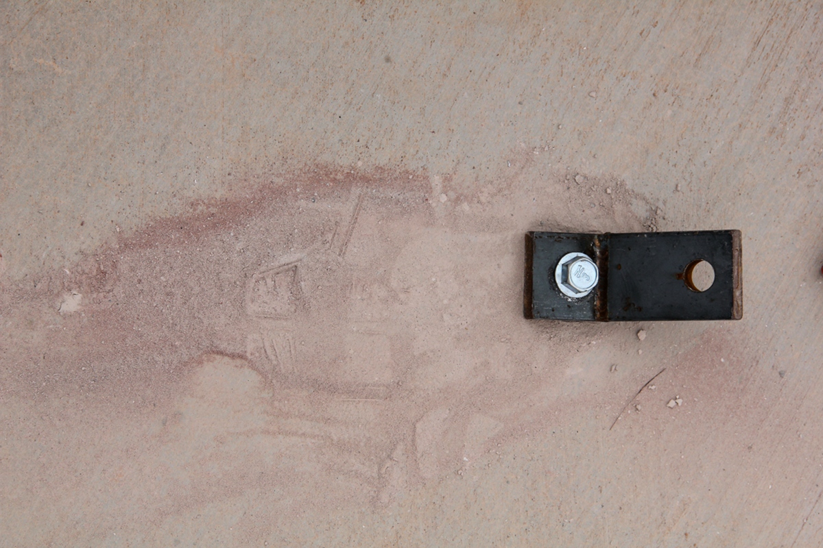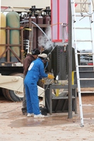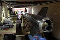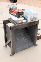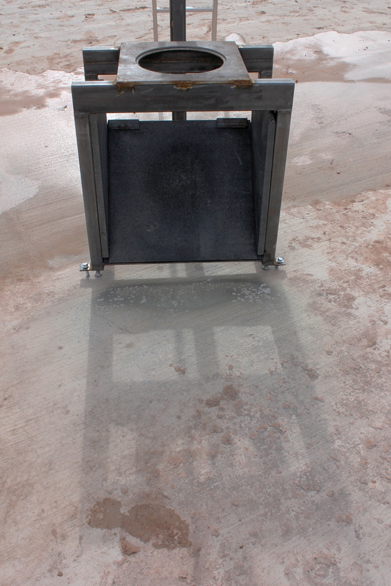We didn't need to haul the huge flatbed trailer behind the crane truck on this trip, and the launch stand for the first tube rocket was built to mount to the rear of that trailer. We revised the design to set up on a flat pad, with the rocket sitting on a combined blast deflector/rocket stand, known as a "milkstool" in some prior rocket programs. The blast deflection was contributed by 1" thick graphite plates ducting the plume laterally.