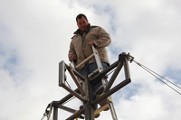 The rocket could freely stand upright on that rocket stand, but to keep it from falling over in a gust of wind we built a cable-guyed launch tower as well. It used butterfly arms similar to what was used on Stig's launch stand, as well as lengths of aluminum extrusion (that any high power rocketeer would recognize) to act as short rails holding T buttons on the rocket. The tower also served as a ladder stand, for unhooking lifting straps as well as installing and starting cameras just before launch.