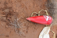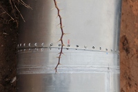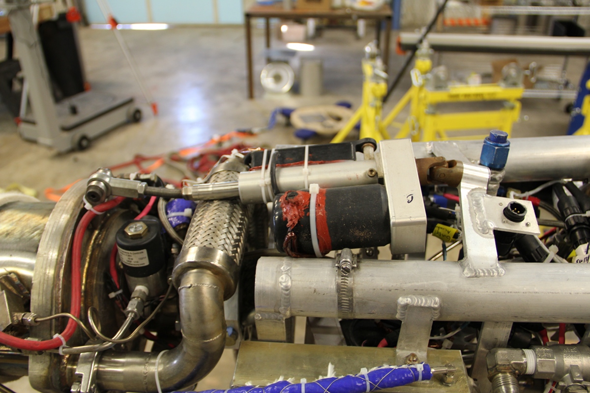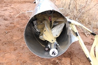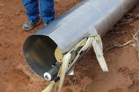 On site we evaluated the rocket and recovery. The landing was significantly faster than intended, which pushed in the bottom of the fin can on landing. The connection just above the fuel tank had sheared most of its bolts as the rocket fell over onto a hillock. The recovery system had also managed to pull the synthetic parachute lines through the 0.090" thick aluminum tube during the deployment.