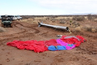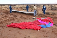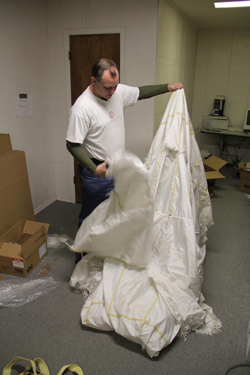 Because the ballute hadn't worked correctly to slow the rocket, the main parachute deployed at 250 MPH rather than the design speed of 110 MPH. The parachute deploys from the same front opening as the nose and ballute, in a free bag. The parachute has four sets of lines, and upon parachute opening the set of lines on the right front edge ripped due to high loads, which made it impossible for most of the cells on that side of the chute to inflate. With the parachute partially deflated the AGU was unable to steer it and it landed faster than intended.