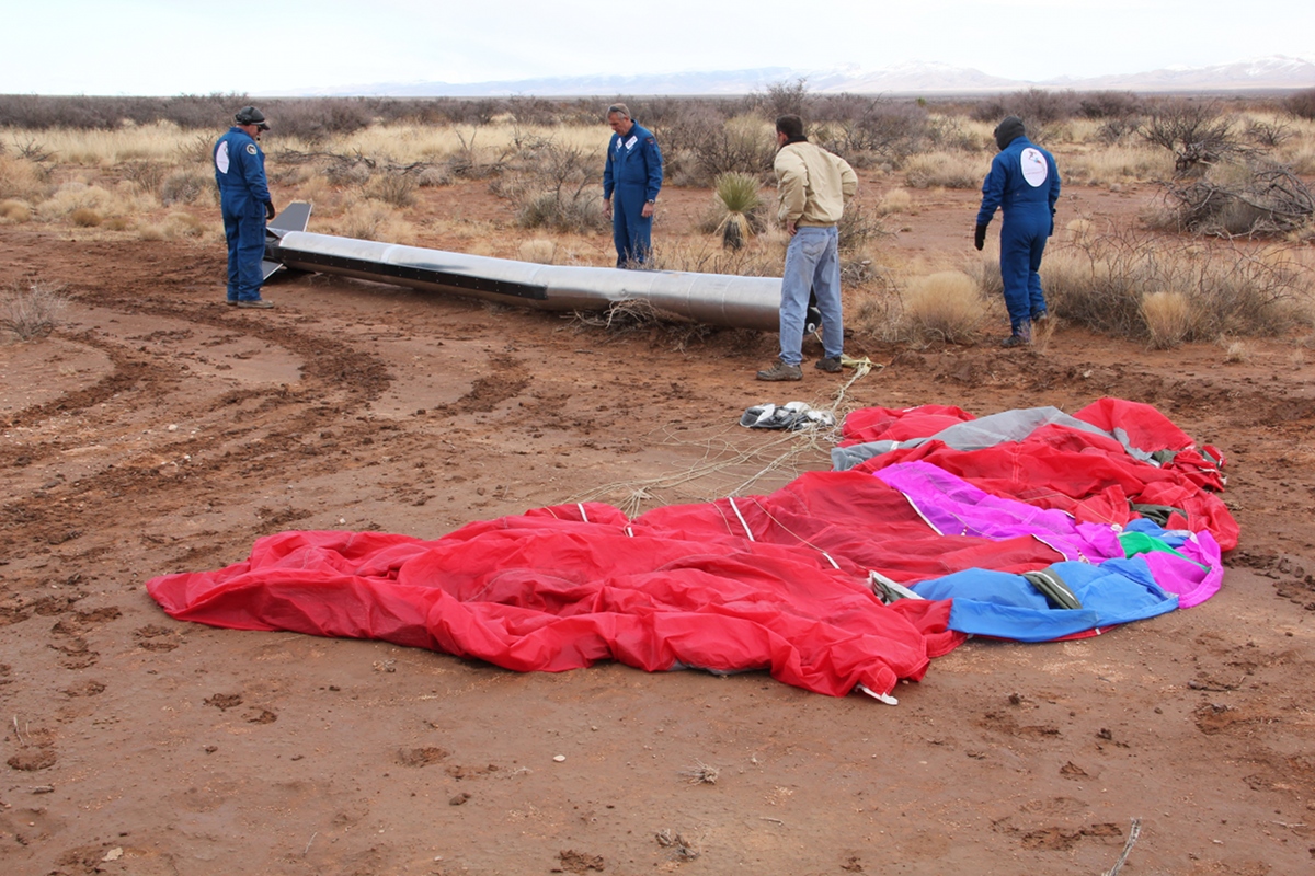 Shortly thereafter Mark Kusbel of Wamore received telemetry from the Air Guidance Unit (AGU) which is the return-to-launch parachute system. It had an independent GPS unit and radio link, and information coming down from it meant that the main parachute had also deployed. There was a relatively quiet boom heard at launch control about four and a half minutes after launch; later we figured out that this was a sonic boom from the few seconds the rocket was falling supersonic. People tracking the launch from north of the pad heard it much more distinctly without the noise of a generator near them.