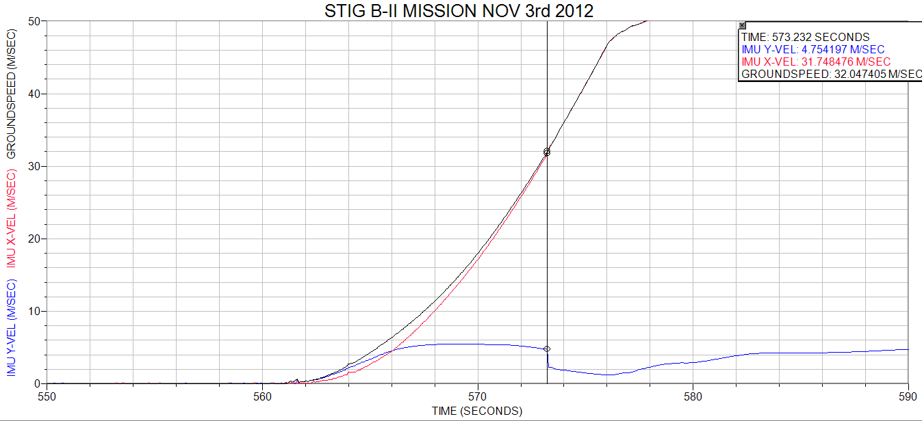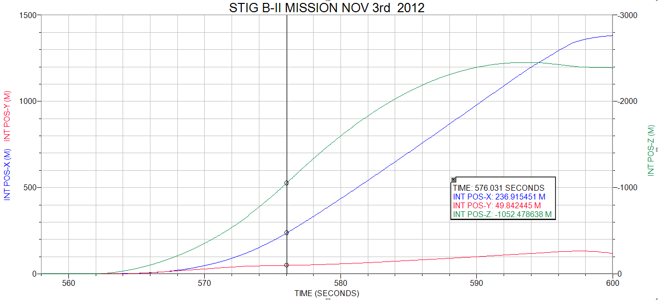 The graph below shows the position from integrated IMU data (GPS did NOT work well!) and the data point shown is at MECO caused by the dry line signal. INT POS-Y is the vehicles N-S axis at launch and INT POS-X its W-E axis. However, the vehicle had rotated 73-degrees during this same period (CCW looking down on the vehicle) so its location was 244-m at an azimuth of ~29-degrees.