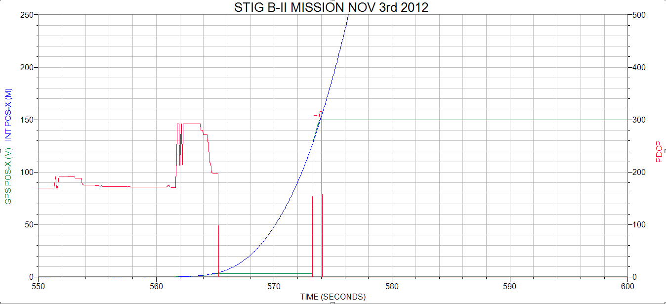 One major issue that needs to be addressed before return to flight is the GPS. At launch initiation it drooped initially and then, after only four seconds, dropped off totally before recovering momentarily eight seconds later but then only for one second. The GPS location in all three axes was still correct based on the IMU coasting value; see GPS POS-X and INT POS-X below. However, had the GPS not recovered momentarily when it did, we would have had an even earlier shutdown on shutdownGps after a 10-second LOS.
