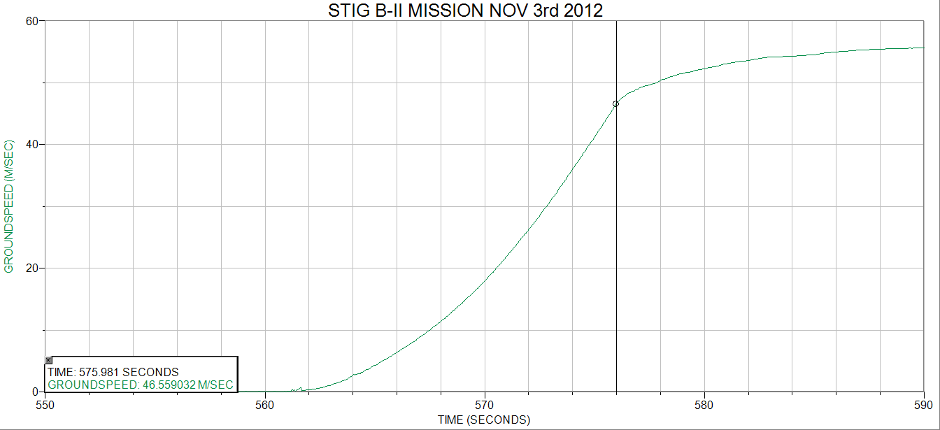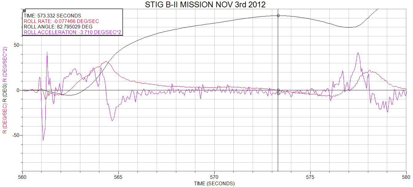 From here on it appeared that we were going to be watching a repeat of the STIG B-I mission. However, this was not to be. Despite the orientation of the vehicle at apogee, the ballute and nose cone deployed successfully, yet again proving the rugged design under adverse conditions.
