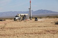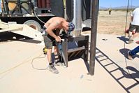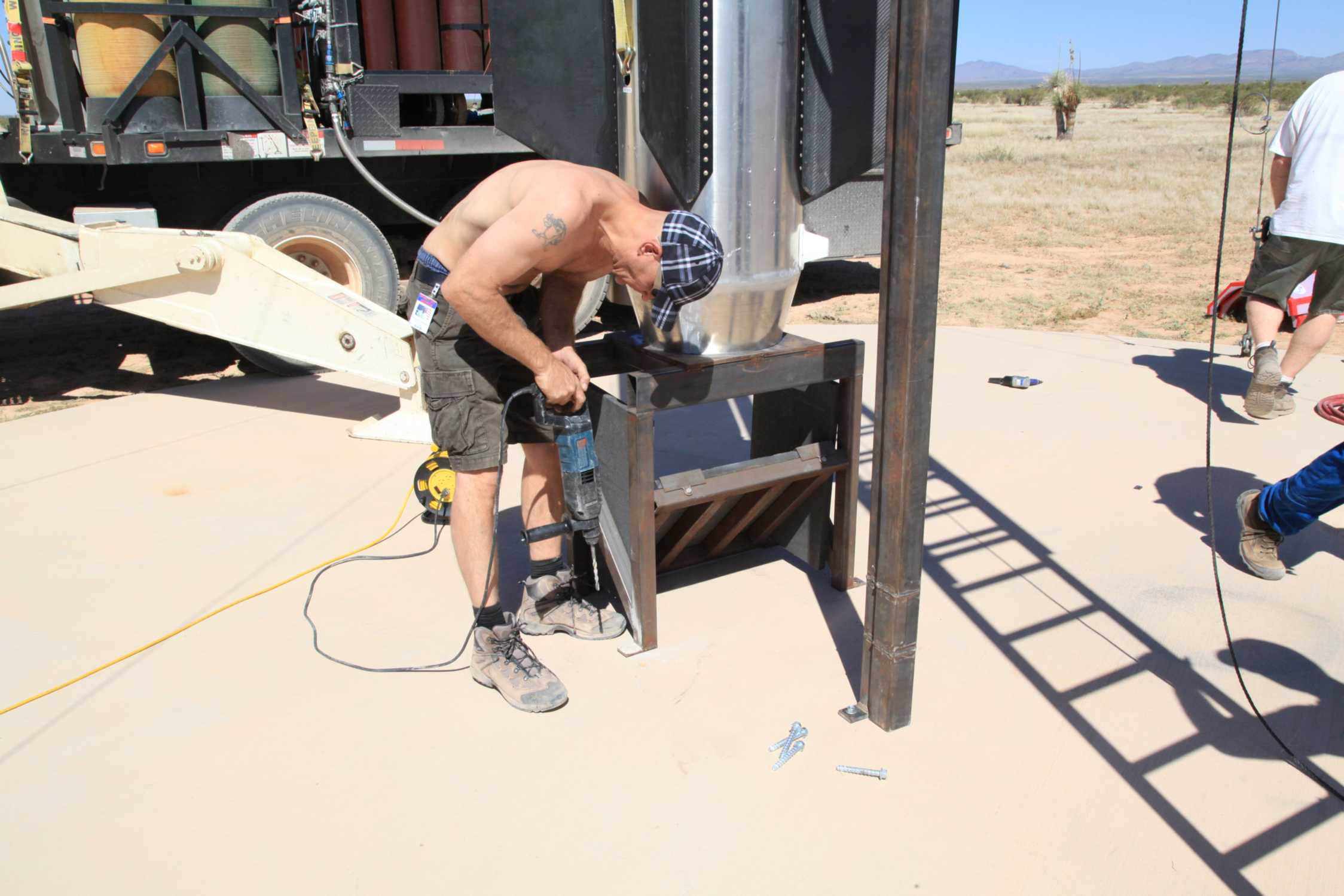 The preparation, packing and travel to NM was uneventful. We appear to have the NM border crossing situation under control now and although it takes anywhere up to an hour to get through the Port of Entry, it is at least a formality. We followed the same two day preparation routine with a dry run on the Thursday afternoon and Friday being final preparation and MRR at the NMSA offices. Thursday we had to drill new holes for the launch stand stool to accommodate the rotation required by the IMU problem encountered on the STIG B-I mission.