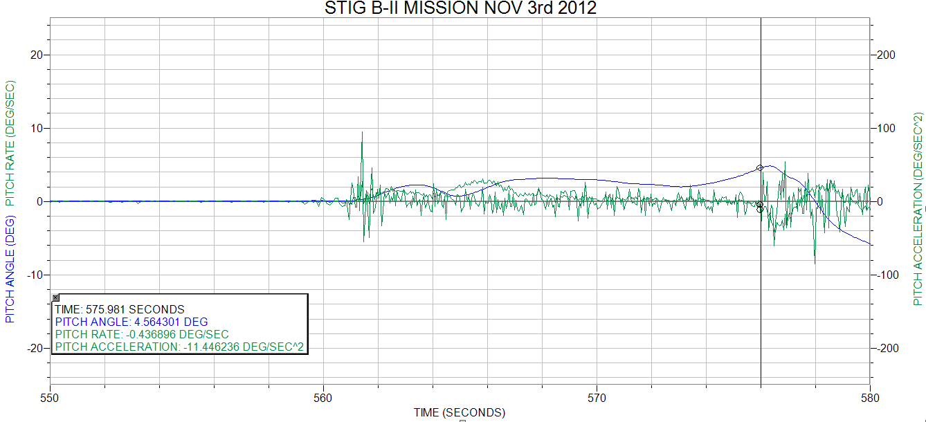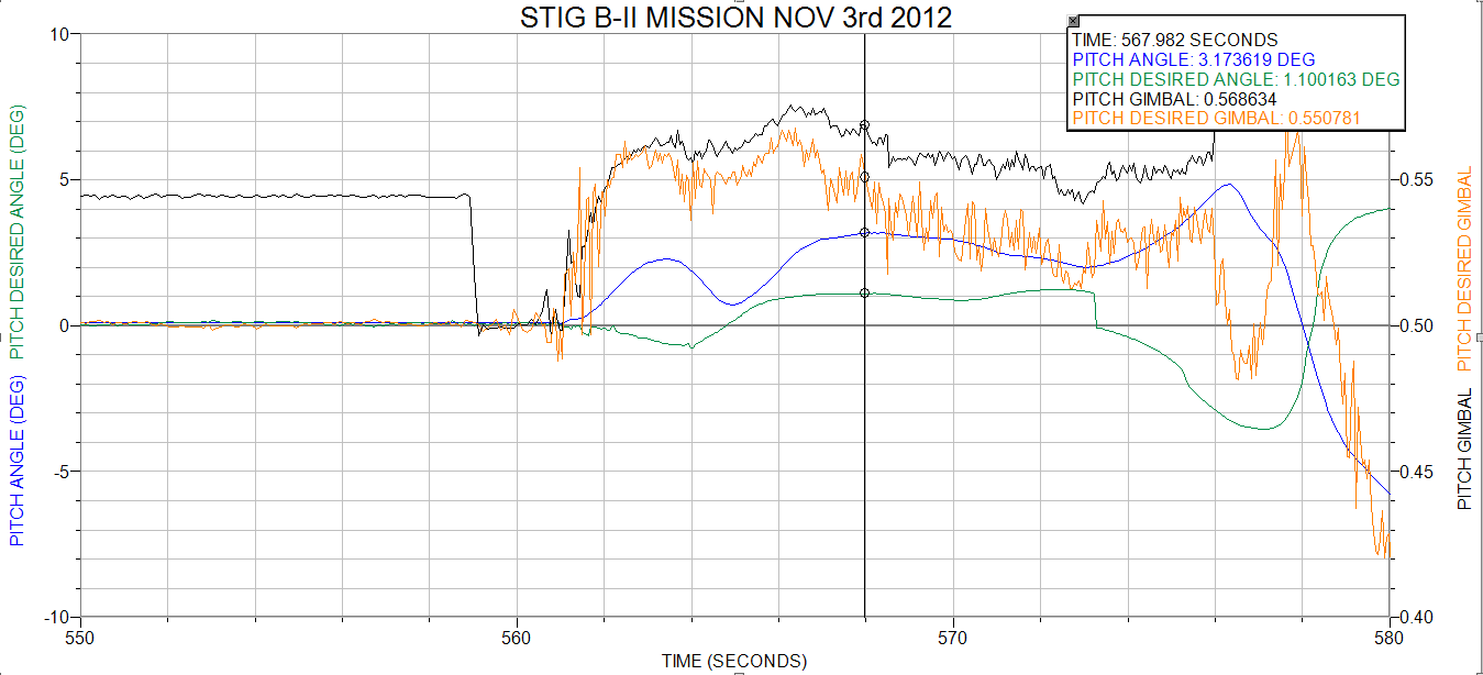 The following four graphs for pitch and yaw are based on the vehicle IMUs Y-axis being North-South / Pitch and X-axis West-East / Yaw. The first graph in each series is the angle and desired angle (as determined by the flight computer) and the second graph in each series is the angle, angle rate & angle acceleration.