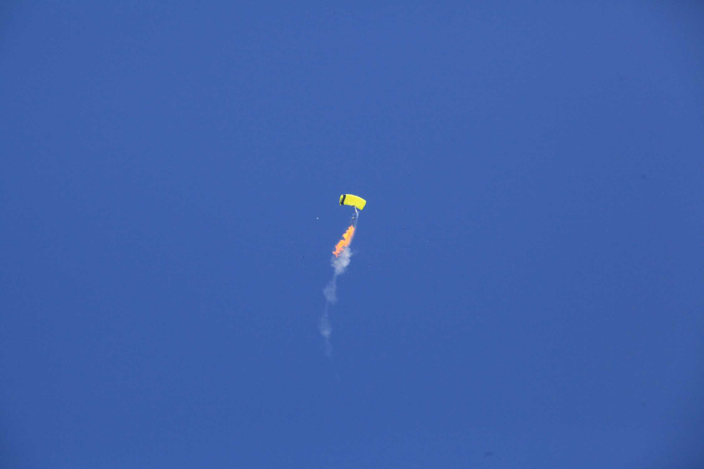 After several seconds of dumping propellants, the propellants did ignite resulting in the destruction of the engine chamber and the fin can. These components fell to the ground within a very narrow debris field and the residual propellants dumped without further incident from open lines.