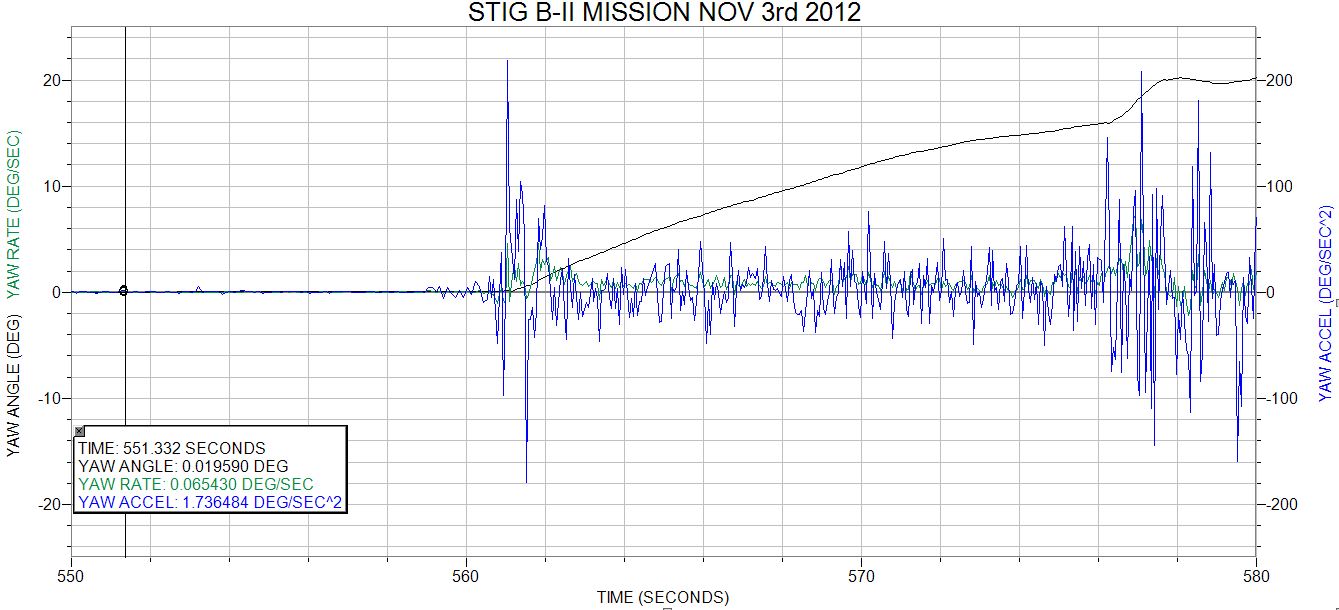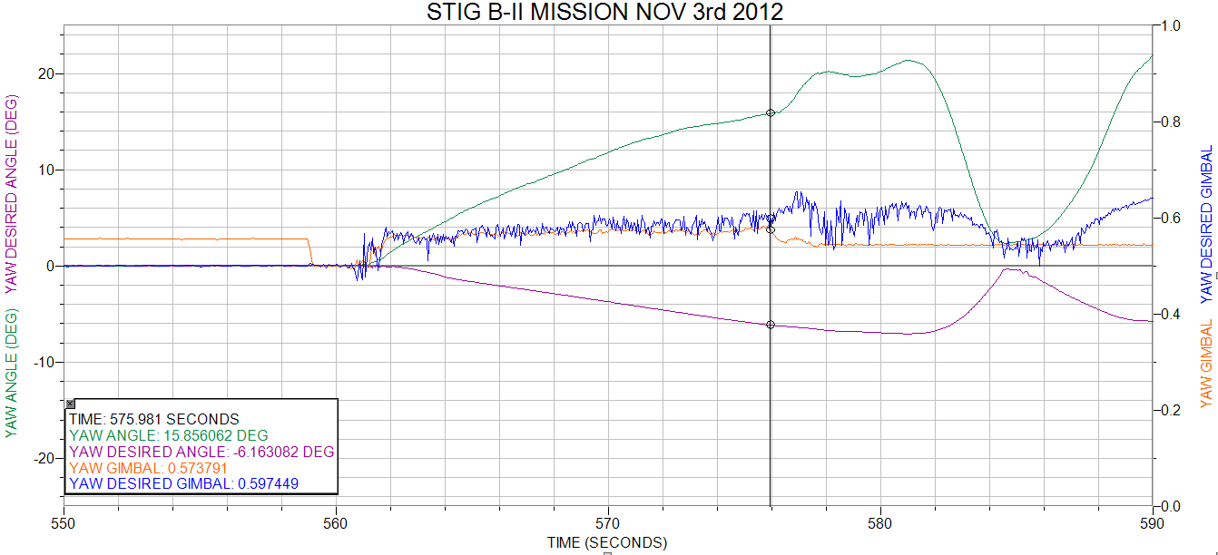 The yaw angle situation is much worse and would have led to a shutdown on ground velocity (imminent) and/or IIP had not a dry line been triggered before that. Again, the requested response appears to be in the correct direction but without sufficient control authority to halt the yawing moment. The yaw rate is decreasing through the boost phase (more clearly seen from the yaw angle curve than the noisy rate curve) but it is never reversed resulting in a significant yaw angle and, consequently, a large displacement and velocity in that direction.