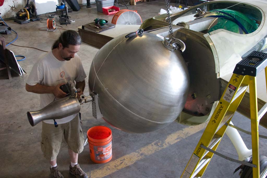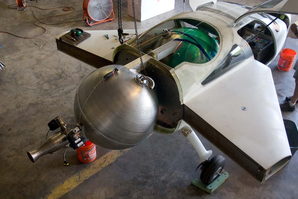 The Bridenstine DKNY Rocket Racer's® propulsion system begins to take shape, joint integration by the Rocket Racing League and Armadillo Aerospace. Airframe modification by the Rocket Racing League.