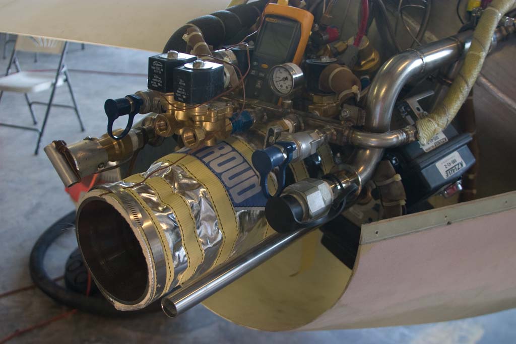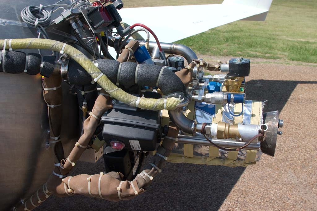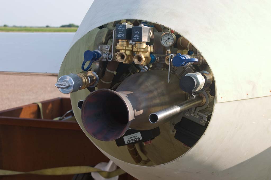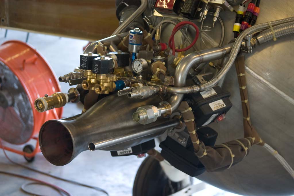 On the remaining flights, seven total, we discover things about the plane and its handling qualities, what pressures to run the propellant tanks at and a bit more refinement on the checklist and procedures. We learned things about propellant slosh in flight, shaking the tanks during the pressurization cycle to cool the helium more and so on, some callouts in the checklist are just too wordy and we decided that we would always do a post flight de-tank even though we know all residuals were dumped out in flight because someday this is going to be turned over to a team and the flight may not end with empty tanks and we wanted to practice procedures they may need to use. So I made two post flight procedures, one if there was pressure still in the tanks and one if they were fully vented. The first we already had because of all the preliminary tests on the crane truck and non-flight tests of the full-up airplane. Len even did a barrel roll (half un-powered just in case the engine pushed too hard), climbed at up to 65degrees and just kept awing me with his rock steady skill. Ok, the engine was really cool too, but I get to see those all the time. Isnt life grand, to be able to design, build, and operate then just simply watch such a powerful piece of machinery perform exactly as expected. There are certainly a number of inherent risks doing this, but its rewards are well worth it.