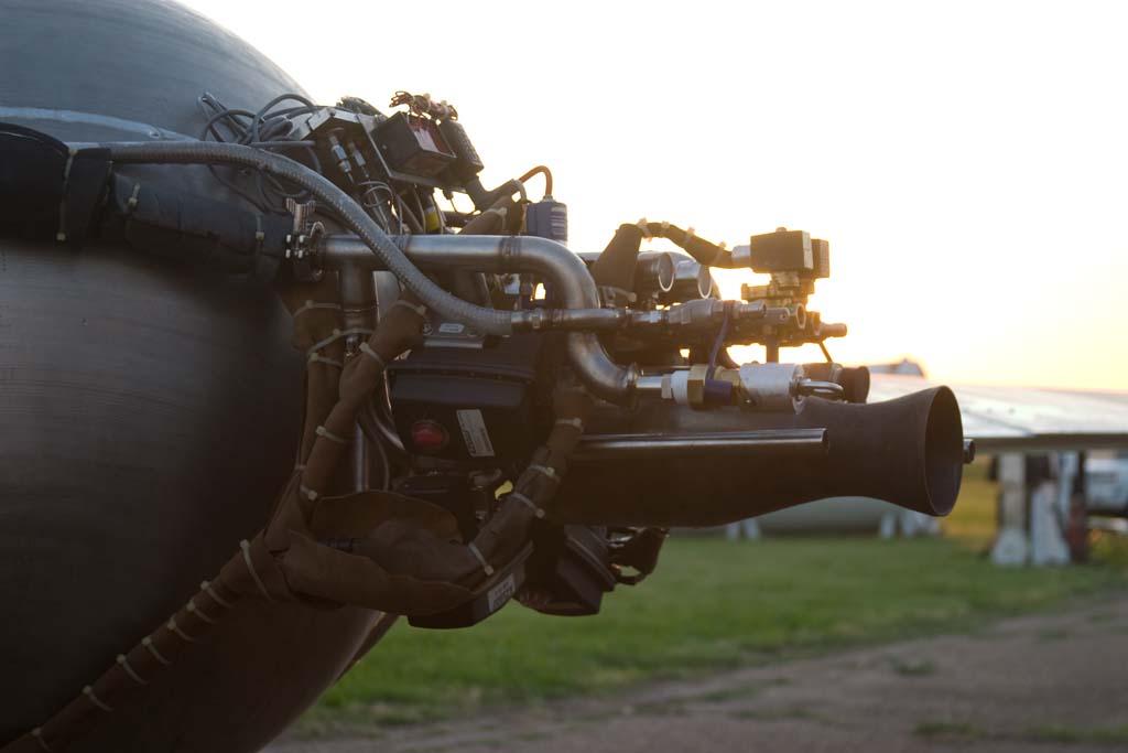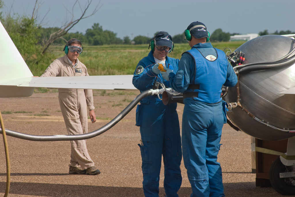 I didnt really go over who was involved with this so let me clarify, Len Fox is the pilot, a professional test pilot with a pedigree worth reading about so I wont go into it here; suffice it to say he really knows his stuff, in the air and on the ground. Phil Eaton was acting as PAD1 (pad crew in charge of working directly with the vehicle when doing propellant operations), one of my best friends and no one I could trust more to work with during the hazards of operating rockets. Tommy Bishop who was acting as my second, learning the ALC functions, driving the tow truck and going back and forth from me to the rest of the crew when needs arose, plus making sure we took everything we needed to Oklahoma in the first place, meticulous and a first-rate guy all around. James Bauer, driving the crane/fuel truck, operating the fueling control panel and helping keep the consumables ready for operations, an excellent craftsman and responsible for more of the fabrication on the propulsion system than anyone else. I myself, Russ Blink, taking the ALC duties which John Carmack our leader normally handles, interested in rockets since my dad worked on Apollo and simply glad to have gotten together with Phil and John to start Armadillo. We proved that a minimal crew can operate this complex system safely, expeditiously and repeatedly at a tempo unmatched by anyone else I know of. It was a true pleasure working with them and I will jump at the chance to do it again when the plane returns from Reno, ready to expand its envelope and get ready for public performances in the near future.