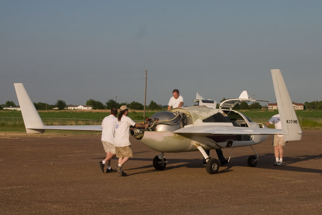 As we appear to be plagued with nothing more or less than perfection from weather, hardware and flight data; every opportunity we chose to make a flight, we made a flight. Every component on the propulsion system worked without a hitch and Len was able to collect all of the FAA required data in the 7 flights made in 3 days plus one evening! The aircraft performed for the most part as expected, and we will be able to continue the flight test program on a much shorter runway in the very near future. We were able to contain every single flight to an area of less than 3,000 feet of the 15,000 feet available at Burns Flat.
