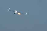 Everything is in place and ready to go. Once again, the aircraft leaps into the air in just under 7 seconds and maintains a steady climb to altitude. We can hear Len calling out planned flight test results and Russ jots them down for review in the post flight debriefing. The air seemed perfect, and the aircraft attains an altitude of over 10,000 feet as the engine senses the end of its propellant load. the plane flies graceful circles about the airfield, and 12 minutes later is lining up for final approach just as planned. the landing was perfect, and Len was able to coast to a stop just past the hold short line on the first taxiway as if he had performed the same maneuver dozens of times before!