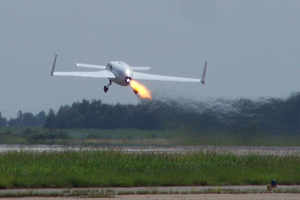 First flight, Oklahoma Spaceport, August 25, 2008, takeoff (wing camera has no audio) and landing (MPEG1, 9MB; and WMV, 4MB)