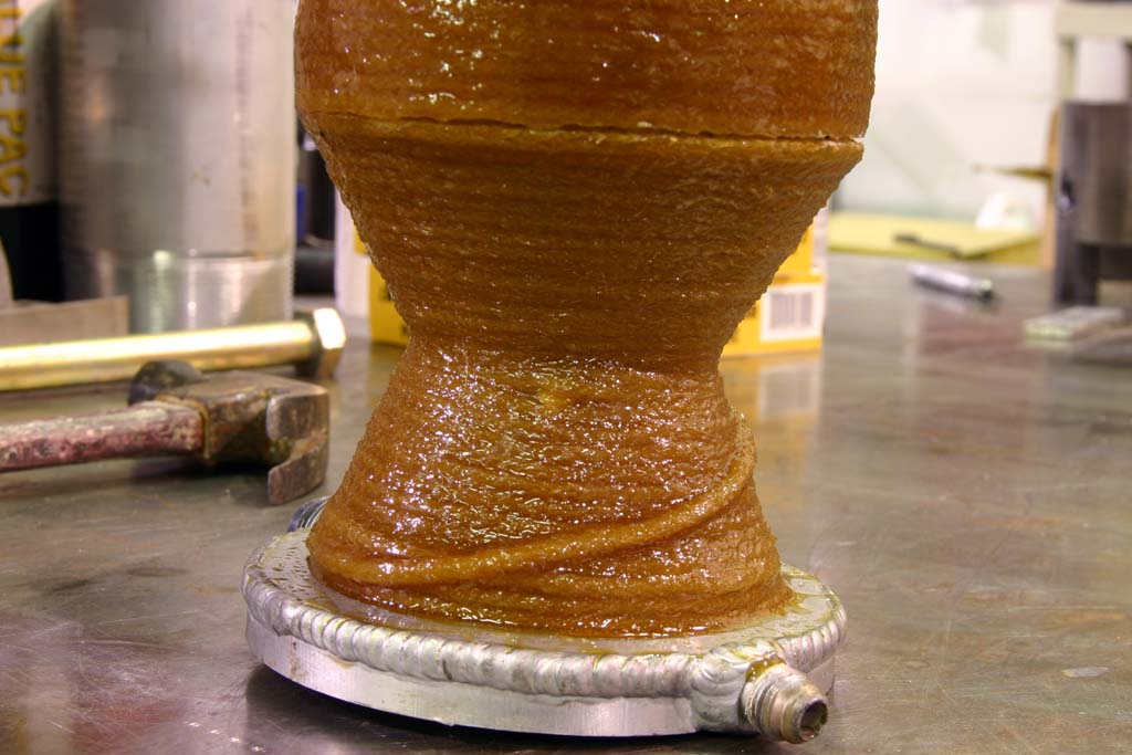 person held the tub with the epoxy and cord, one person rotated the lathe by