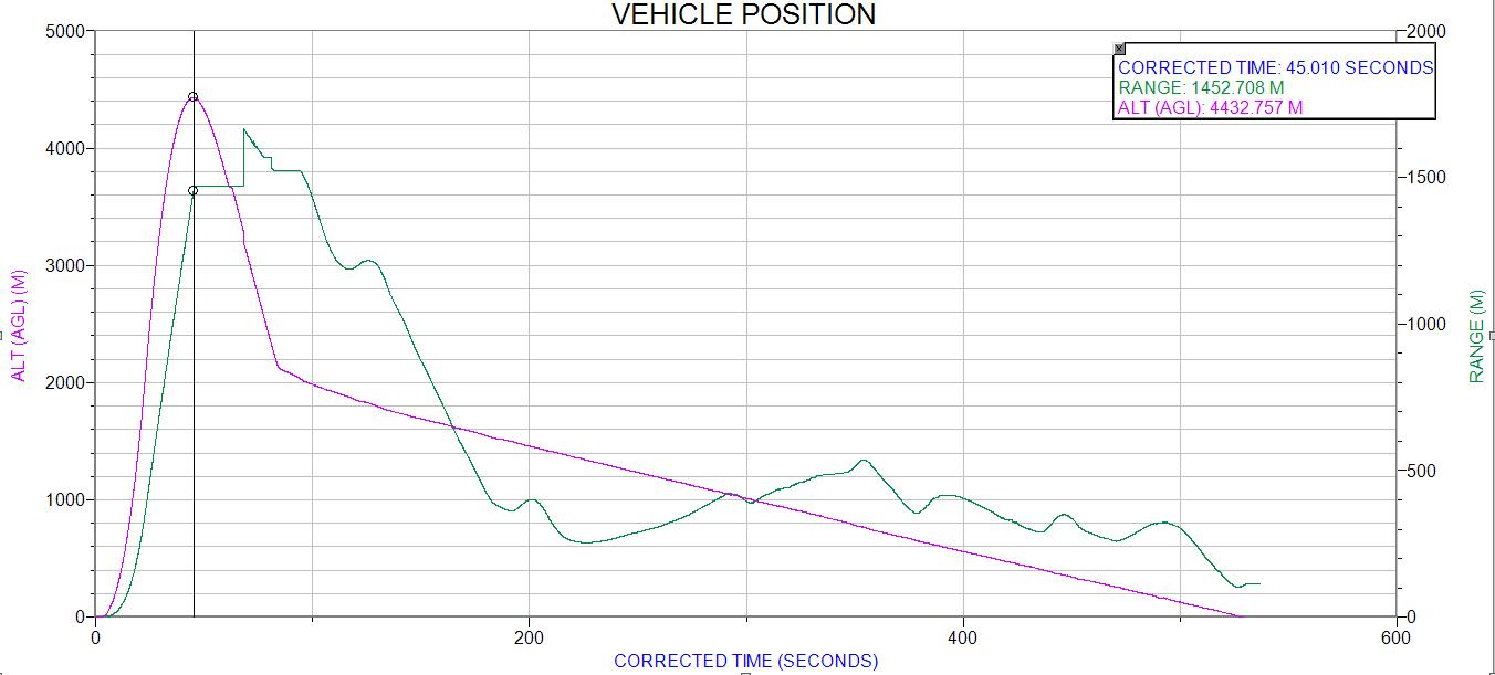 At this point the vehicle weather-cocked, coasted into the prevailing wind and did a gravity-turn with an apogee of 4,430-m AGL at T+44.56 seconds.