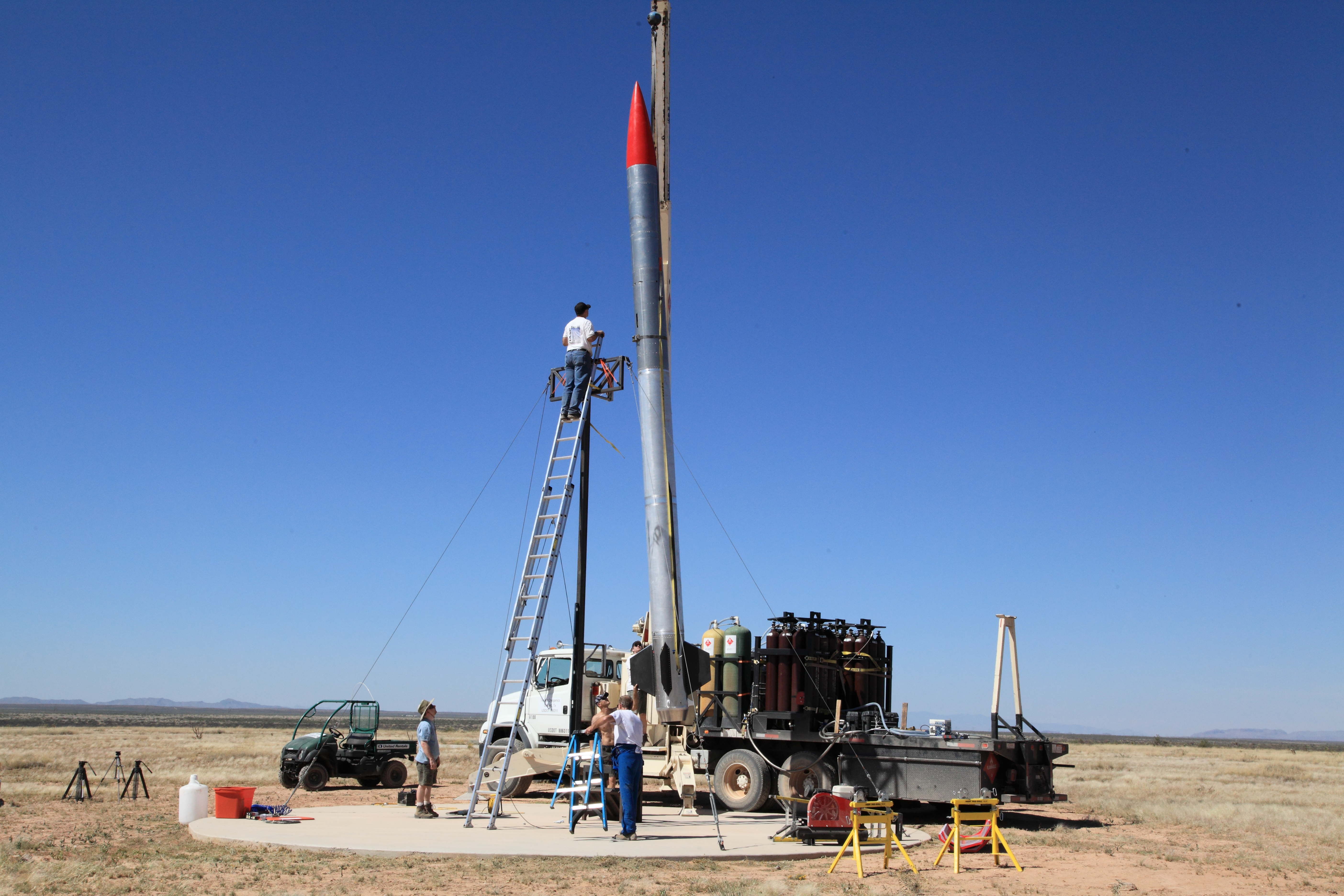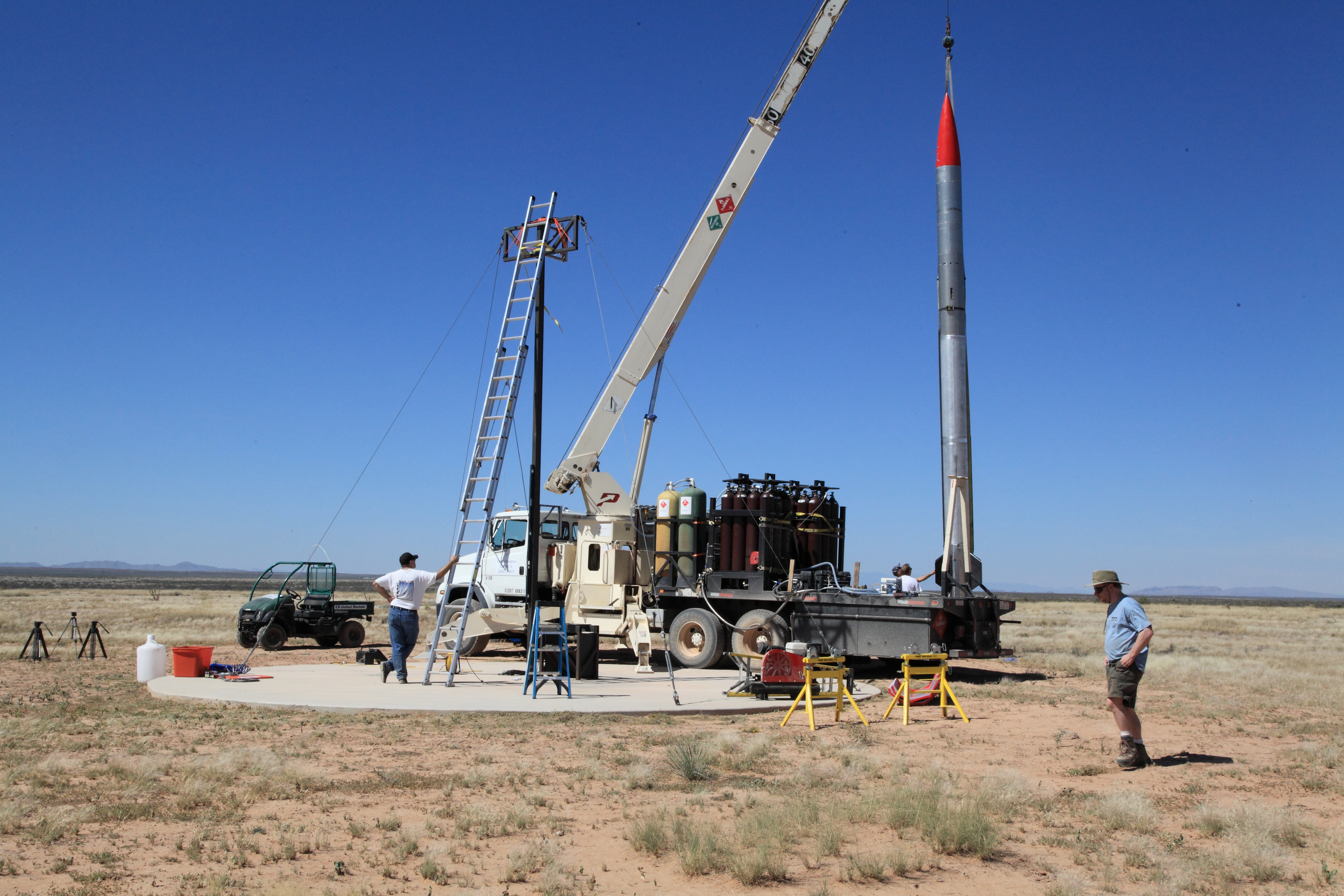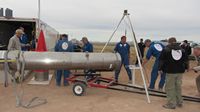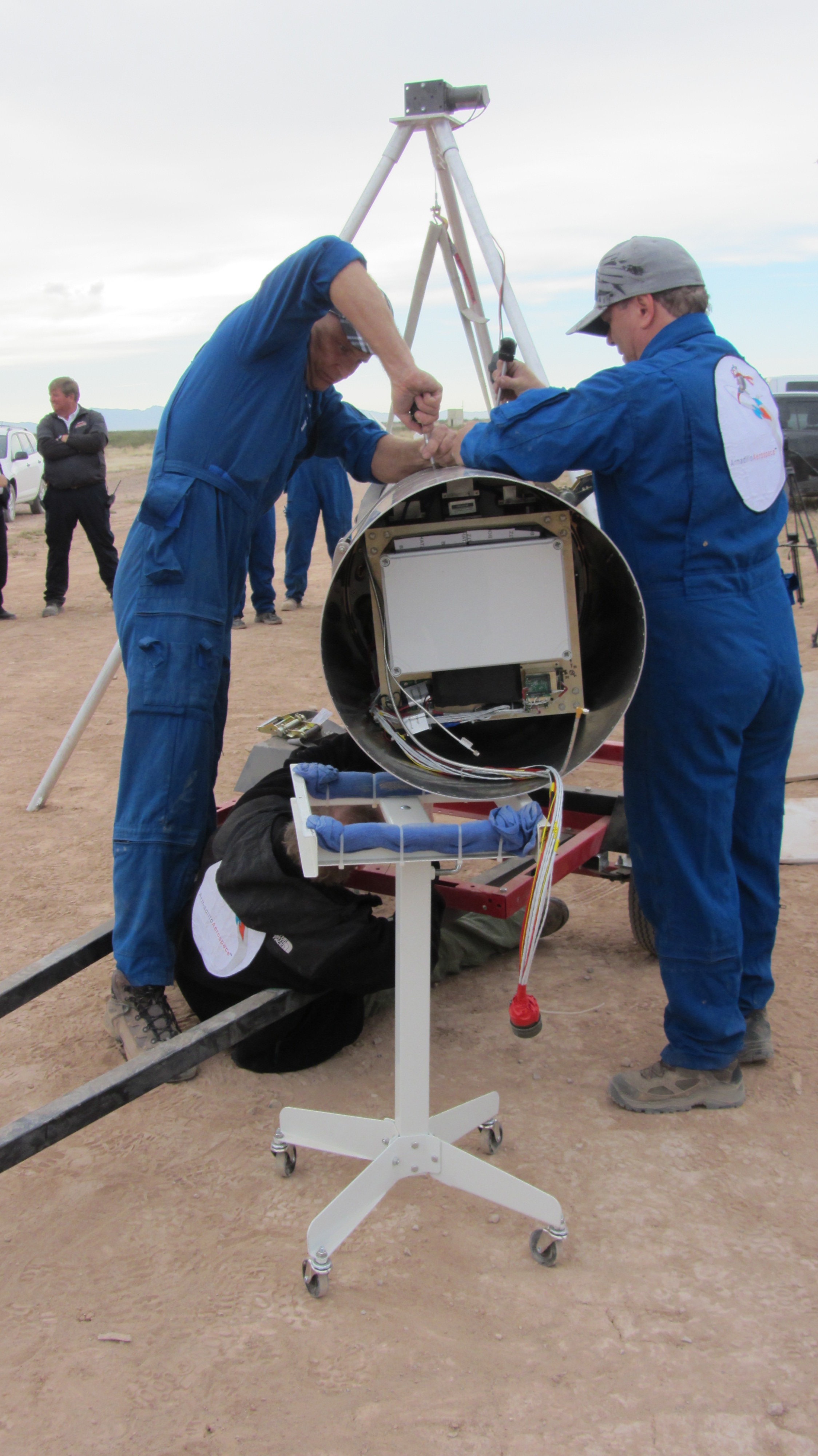 Friday was for tear down ready to install the payloads and to work on the recovery system installation. Wamore still had to program the AGU (Automatic Guidance Unit) for the requisite landing spot and then all the hardware had to be reinstalled. The new tripod built for lifting the vehicle when recovering in the field proved invaluable for installing and removing the modules. During this period we also pumped up the HP helium tank to 5,000-psig and TU Braunschweig pumped down their payload with a vacuum pump which ran all night. The team departed the launch site around 4:00 p.m. to attend the mandatory MRR (Mission Readiness review) which this time was held at the NMSA offices in Las Cruces. It was a bit cramped with so many attending but this looks like it will become the venue of choice for future MRRs.
