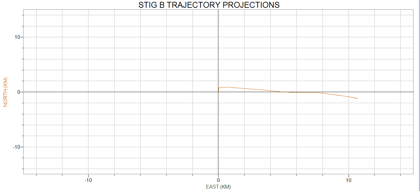 The 15-second countdown and launch was flawless. The launch stand retracted without drama and the boost, although definitely not as brisk as with STIG A, still got off the launch stand in a hurry. It was immediately evident though, even to the naked eye that she was drifting slightly to the West. There is always an optical illusion that she is coming directly overhead which can be disconcerting for neophytes, but this was definitely drifting away from the pad. At T+22.5 seconds (this is from ignition; the time to lift-off is roughly 2-seconds after ignition) the thrust was terminated by the MFC (Main Flight Computer) on Groundspeed exceeding the flight rule limit of 50-m/sec.