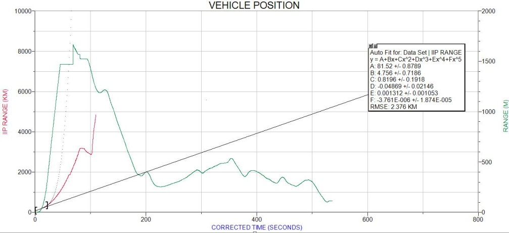 At this stage the vehicle still had the residual fuel on board and we estimate the mass at close to 900-kg (2,000-lbm) at an altitude of 4,500 5,000-m MSL. Working backwards from these numbers we come up with a CD value of 27.6 relative to the vehicle cross sectional area and 0.8 based on the nominal chute diameter (9.75-ft). The value we had been using in TAOS for subsonic velocities was 25.7 so we can now adjust based on test results. However, we still do not have any good data in the supersonic regime which we are anticipating will be considerably higher. The good news is that in the regime for main chute deployment we are good.