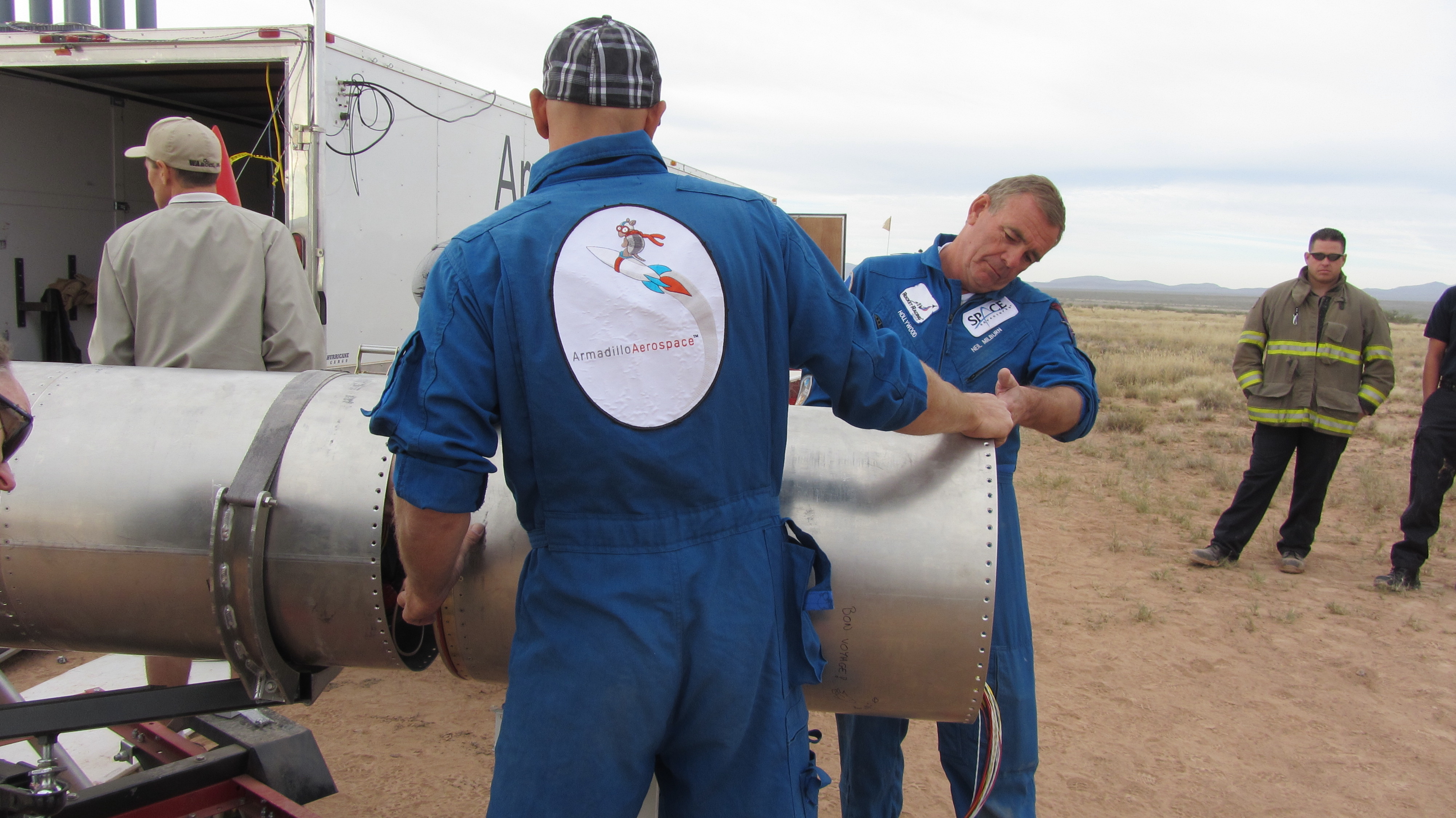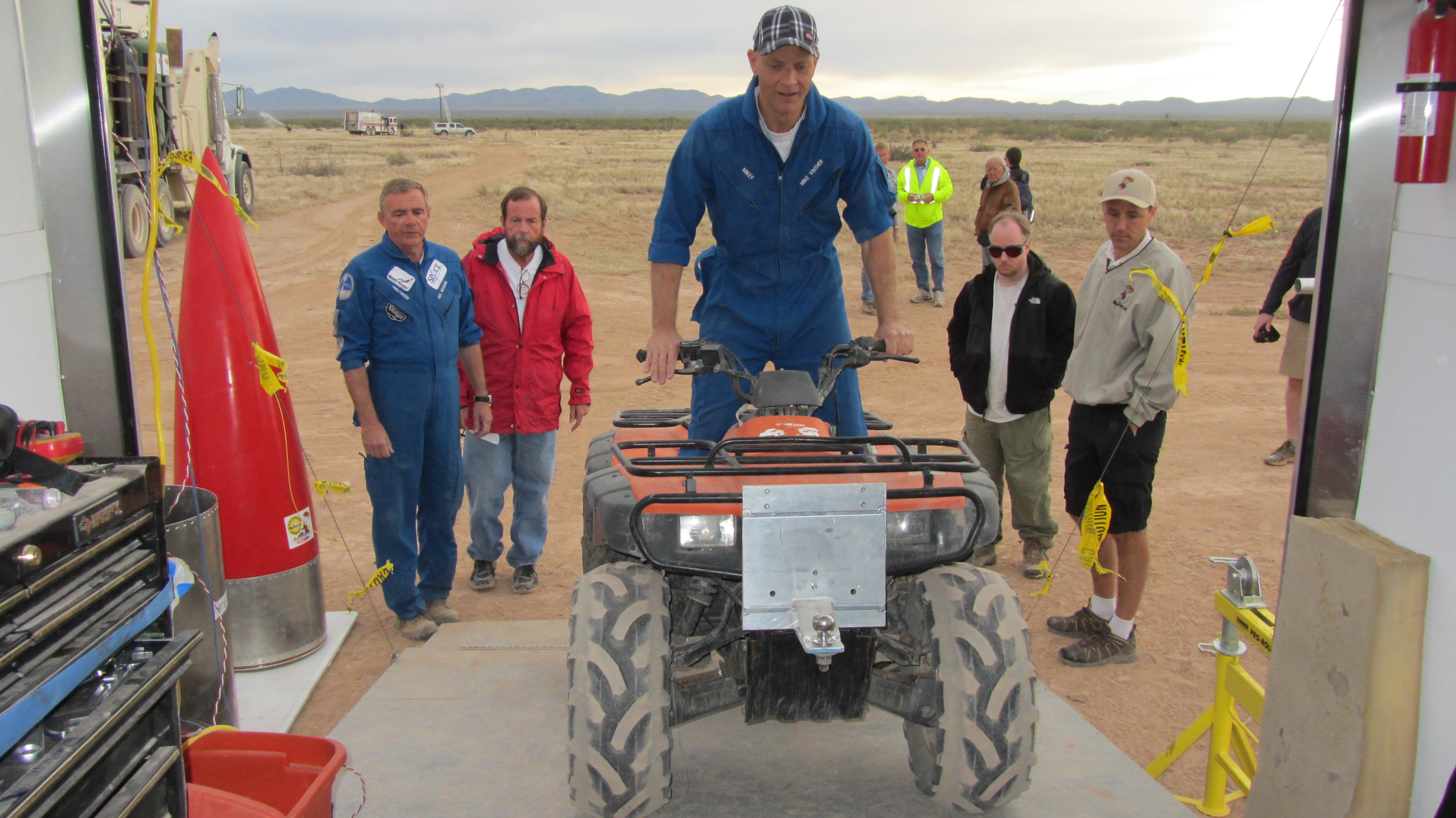 Vehicle preparations took a little longer than we had hoped, about 90-minutes, but we had planned accordingly and even had time to take a few obligatory photographs of the observers next to the launch vehicle on the stand before hazardous ops started. Topping off the HP helium tank took next to no time because the pressure had dropped very little overnight. We had decided to locate the launch control trailer directly facing the launch stand down the dirt track and have the observers located near the UP Aerospace center more than a couple of hundred meters distant. The only people other than the launch team at the Armadillo Launch Control area would be Dave Gerlach from FAA/AST and Bill Gutman the Spaceports RSO (Range Safety Officer.) This worked well and kept the uninvolved well away from the busy ALC area and we will do this again for the next mission.