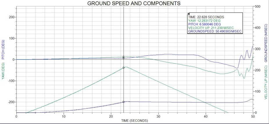 Even with this slight shortfall in thrust, the altitude and velocity just before MECO were within a couple of percentage points of predicted and this before we allow for the energy lost in accelerating the vehicle laterally because of the position offset anomaly. That would not appear to be substantial but, in the same 20-second time period we accelerated the vehicle vertically to 190-m/sec, we accelerated her laterally to 40-m/second.