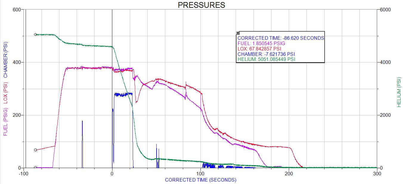 The average tank pressure during the boost phase was 370-psig with a resultant chamber pressure of 278-psig. This is slightly lower than we expected and it didnt appear that we picked up any bonus because of the static head G-boost. The engine is also a little buzzier than we have previously seen at these pressures but there was no audible sense of this from the ALC position.