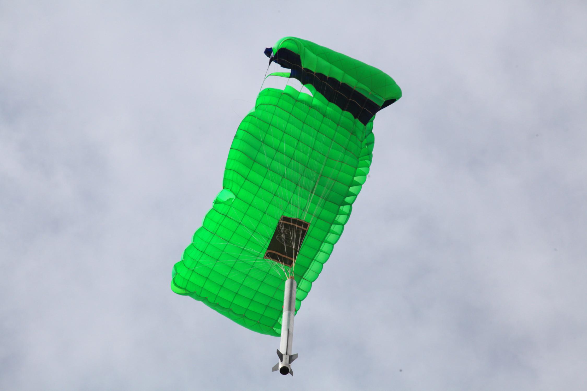 The main chute deployed (on a timer basis because GPS was down; see recovery system notes later in document) at T+83-seconds and the opening was very rapid with indications of close to a 10-G shock. There were signs of ineffective operation of the slider and Strong is working on a solution.
