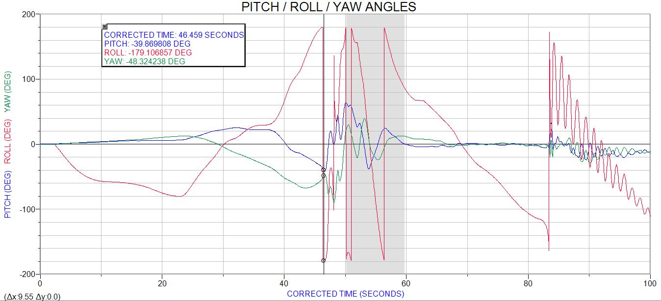 ACS Roll Control: The ACS system remained dormant until MECO as planned and then began to fight the significant aerodynamic forces encountered during the ballistic trajectory through nosecone and drogue deployment. The graph below shows the roll angle, rate and acceleration. The active period is from 22.5-seconds through 45-seconds.