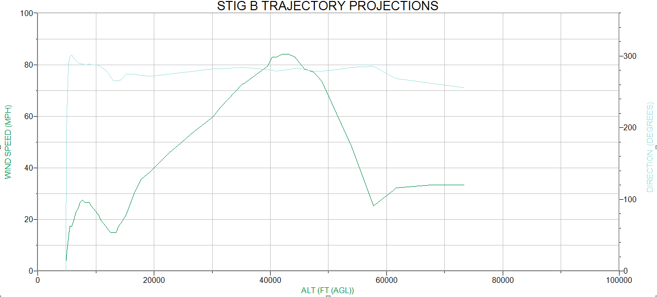 Earlier that morning, much earlier, I had collected the weather data and run a TAOS (Trajectory Analysis & Optimization Software) trajectory analysis of where we anticipated recovering the vehicle and drogue / nose cone. The winds aloft were almost exclusively out of the West which was ideal for direction although they were stronger than we would have liked aloft peaking at more than 80-mph. Wind speed at ground level was imperceptible and likely a constant given the sheltered nature of the desert bowl that the Spaceport is located in, surrounded by distant mountains to the West and East, with lesser mountains to the North.